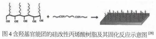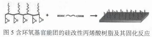 針對自清潔的硅改性丙烯酸粉末涂料展開研究,根據所含基團的不同,分為含羥基官能團的硅改性丙烯酸樹脂體系和含環氧基官能團的硅改性丙烯酸樹脂體系,兩種體系各自的固化反應如圖4和圖5所示。