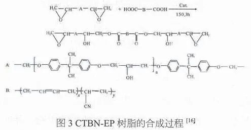 Liu等人針對上述問題,對FBE粉末涂膜進行增韌研究,在雙酚A環氧樹脂(EP)分子鏈結構中通過縮合反應引入了聚(丁二烯-丙烯腈)單元(CTBN),形成CTBN-EP基體樹(化學反應式如圖3所示),并與酚醛樹脂HTP-305反應固化成膜。