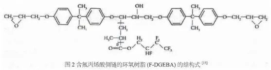 采用自由基聚合方式將甲基丙烯酸六氟丁酯單體接枝聚合到雙酚A型環氧樹(DGEBA)脂肪鏈的碳鍵上,形成具有如圖2結構式的含氟丙烯酸側鏈的環氧樹(F-DGEBA),旨在保持環氧樹脂優良粘結性能的基礎上,降低涂膜表面能,提升涂膜的耐腐蝕性能。